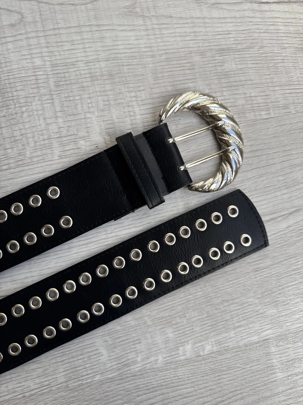 Cinto de eco cuero con hebilla torzada y doble hojal.