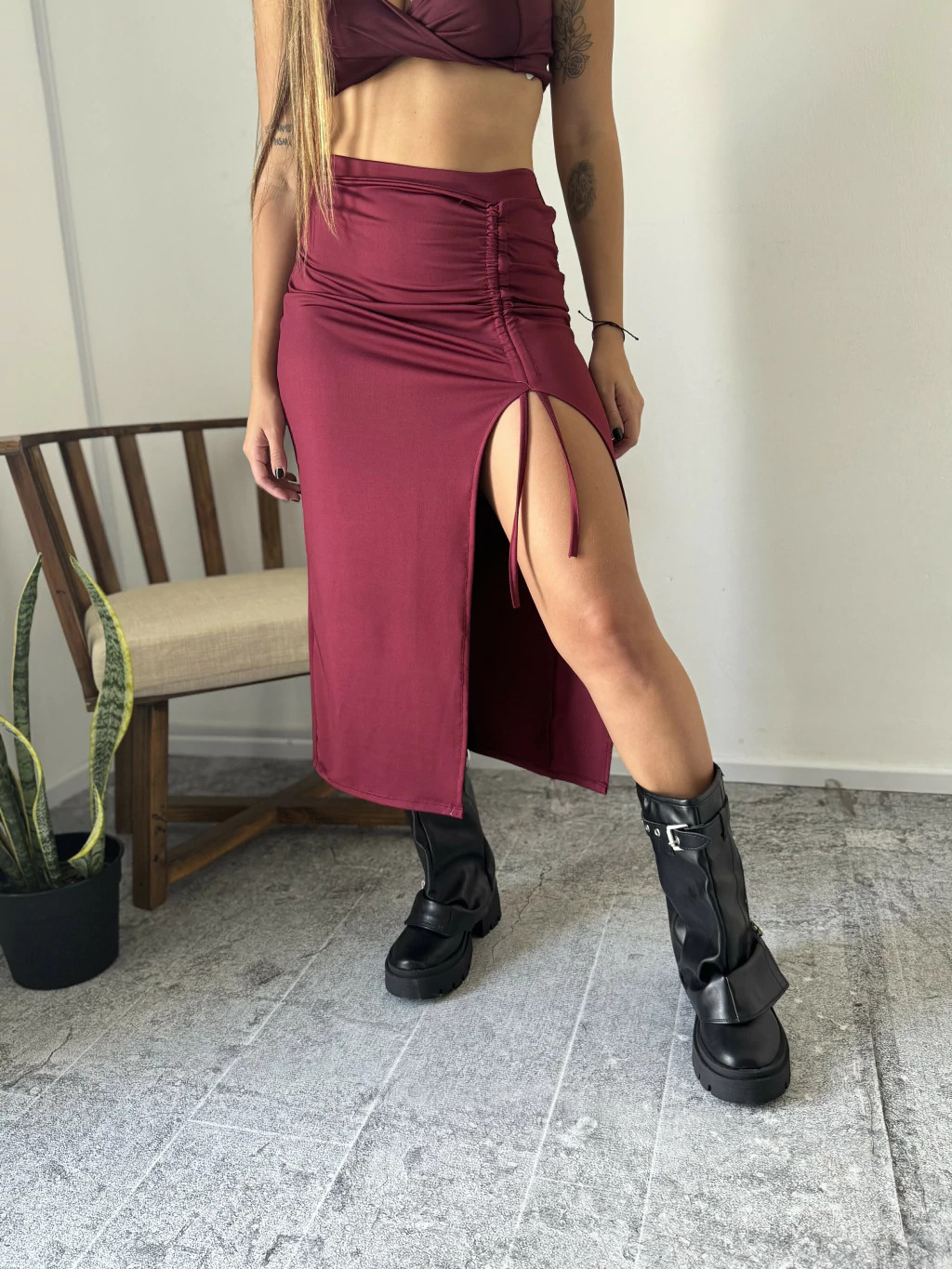 Falda de lycra midi con frunce y abertura en la pierna. Por talle.