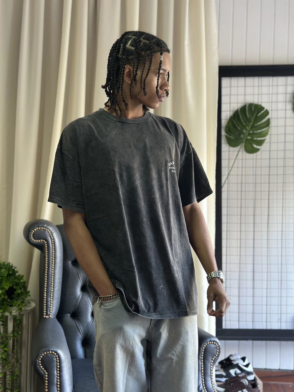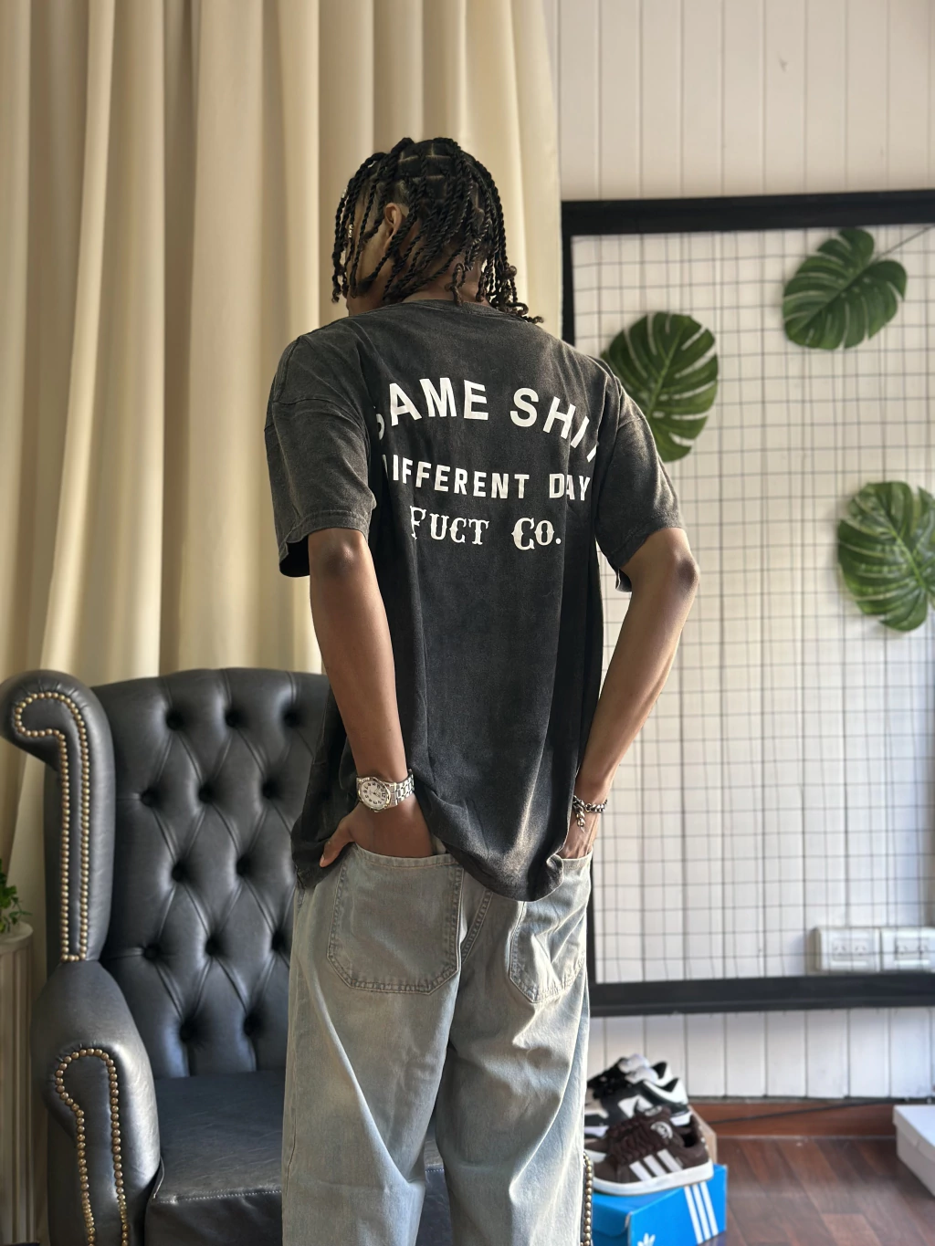 remera batik hecha de algodon, tipo oversize con un estampado chiquito adelante y grande atras con la palabra "same shit different day"